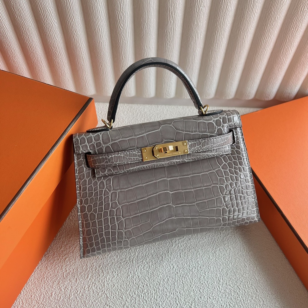 Hermes Kelly Mini M8 Gris Asphalte Polished Shiny Alligator Crocodile Gold Hardware