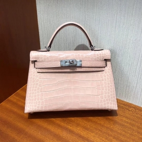 Hermes mini Kelly二代20 迷你凯莉包2代 亮面方块鳄鱼皮 P1蔷薇粉