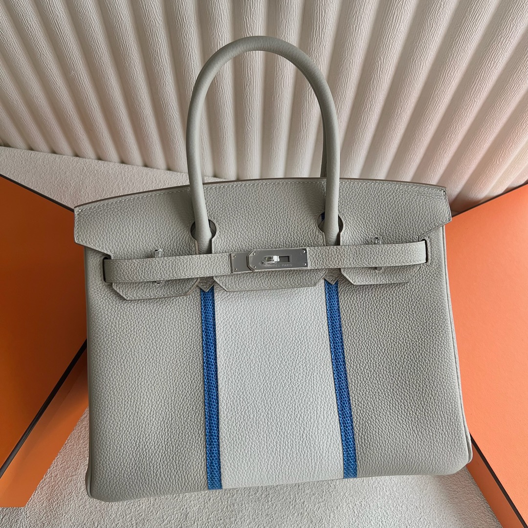 Hermès Birkin 30 Togo Griss Perle Blanc Myokonos Blue Palladium Hardware Stamp W