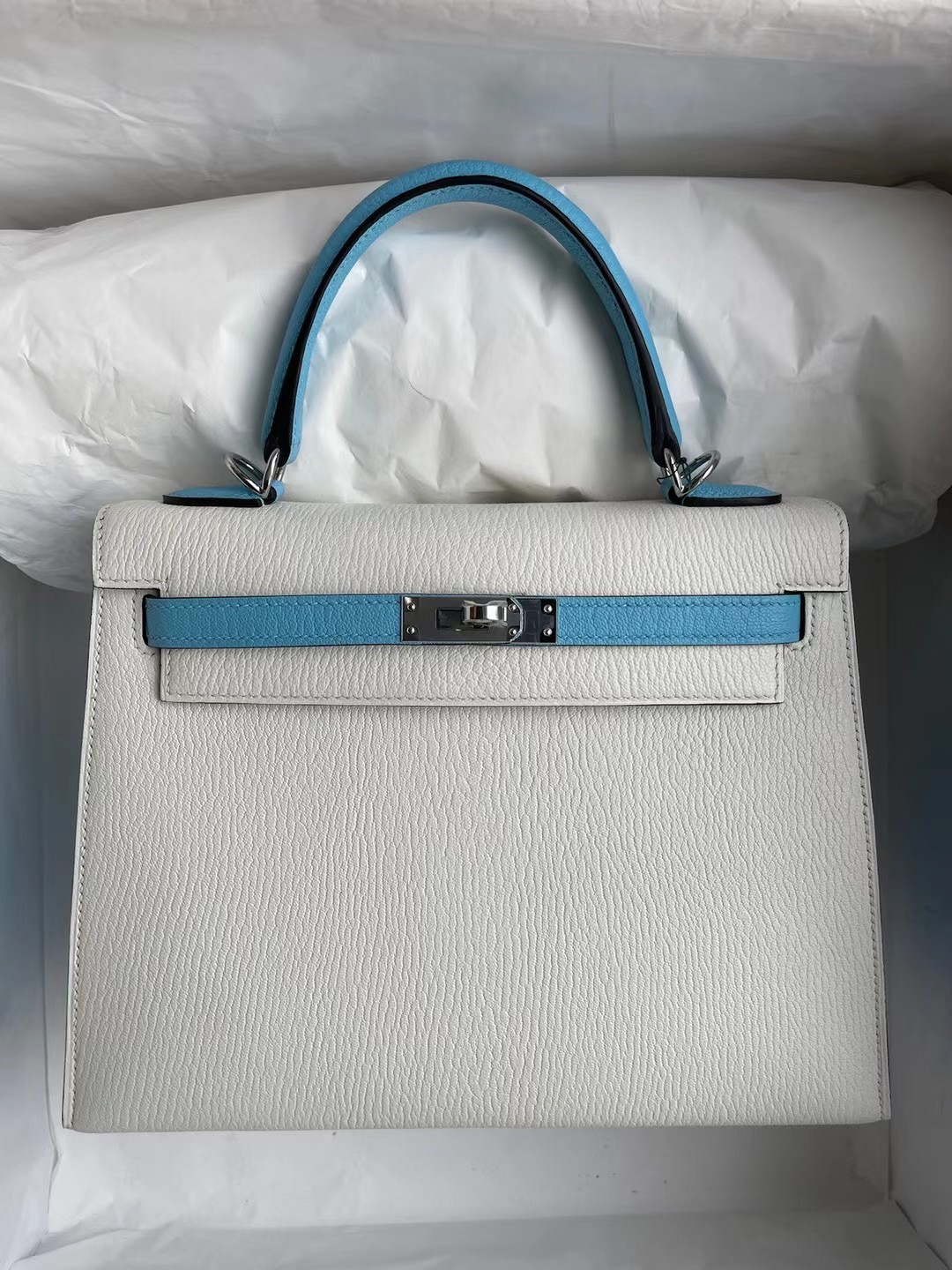 Hermes Kelly 25cm Chevre Mysore 进口 山羊皮 01 Pure white 纯白色/7N Céleste 银扣 全手工蜜蜡线缝制 客定出