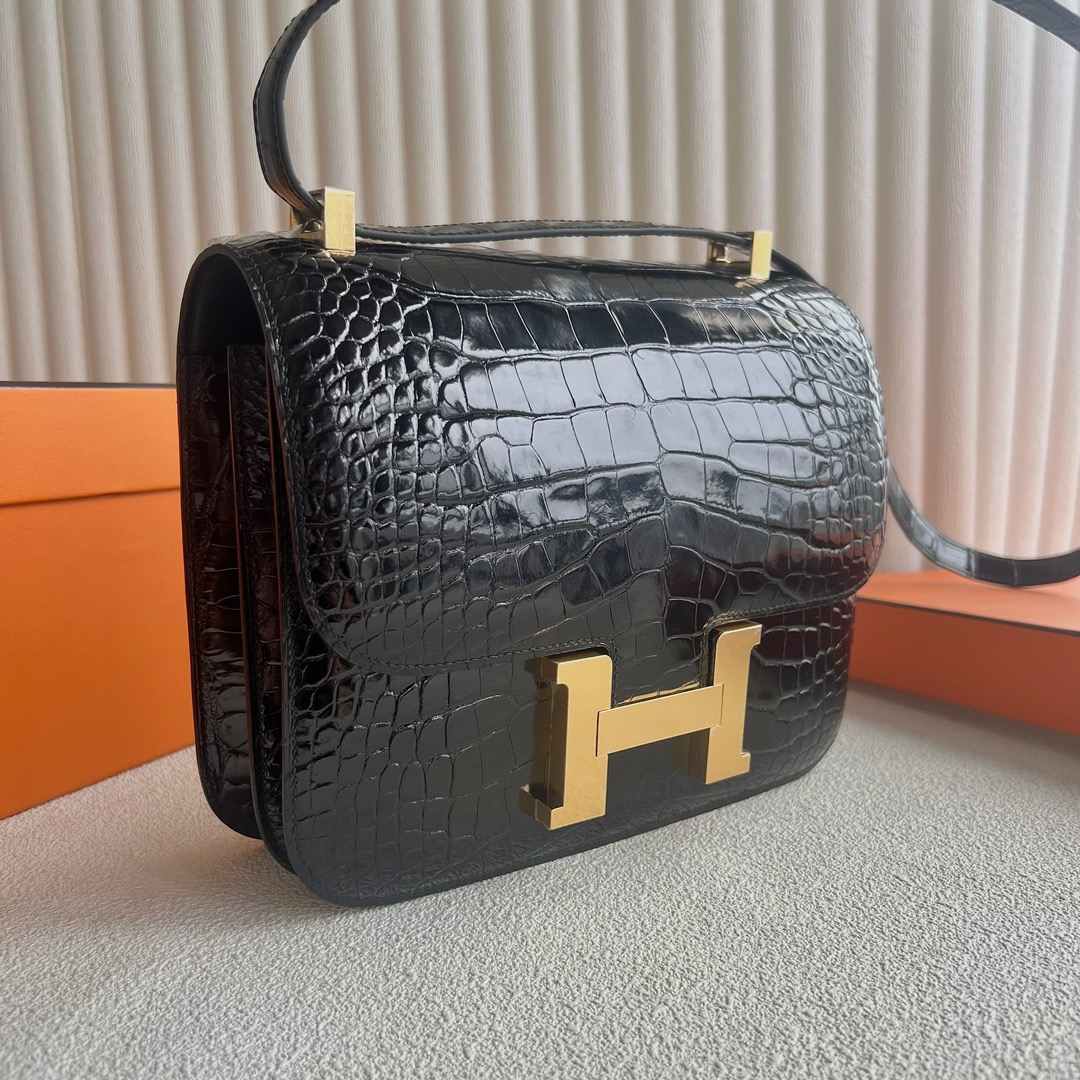 Hermes Constance 24 Shiny Alligator Crocodile CC89 Noir Gold Hardware