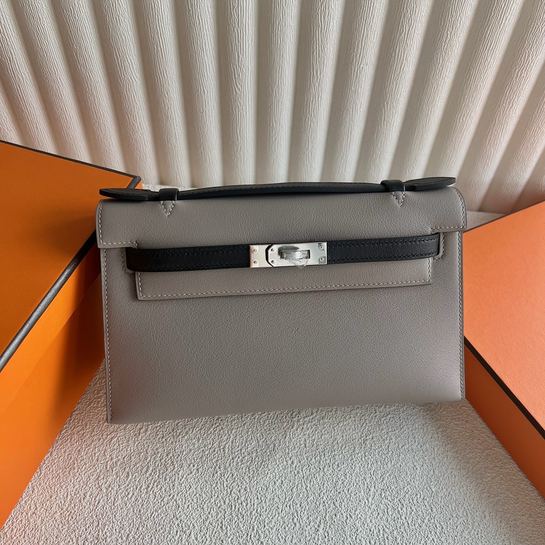 Hermes Kelly Pochette Swift Leather Gris Asphalt And Nior Palladium Hardware