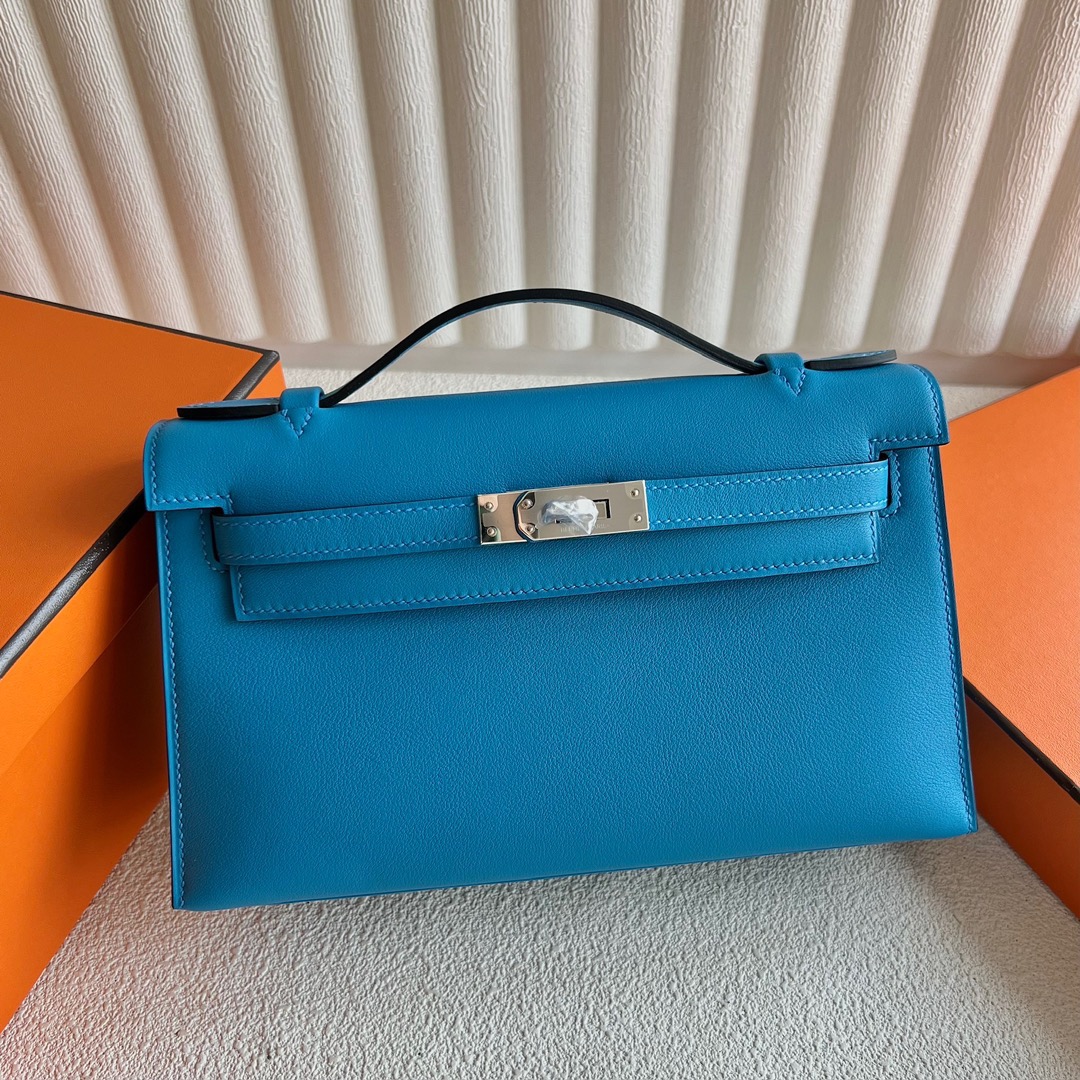 Hermès Kelly Pochette Swift Leather 0F Blue Frida And I2 Nata Palladium Hardware