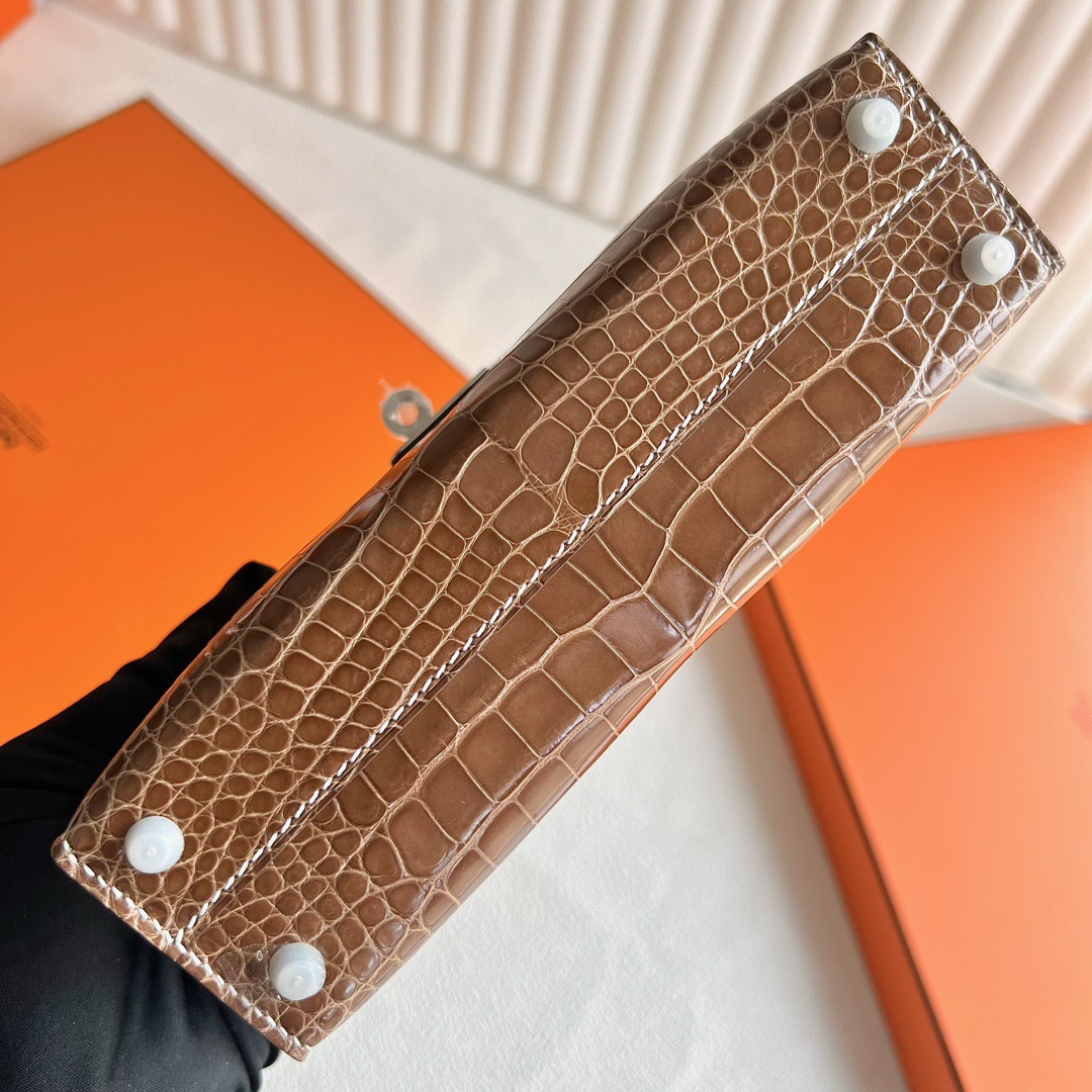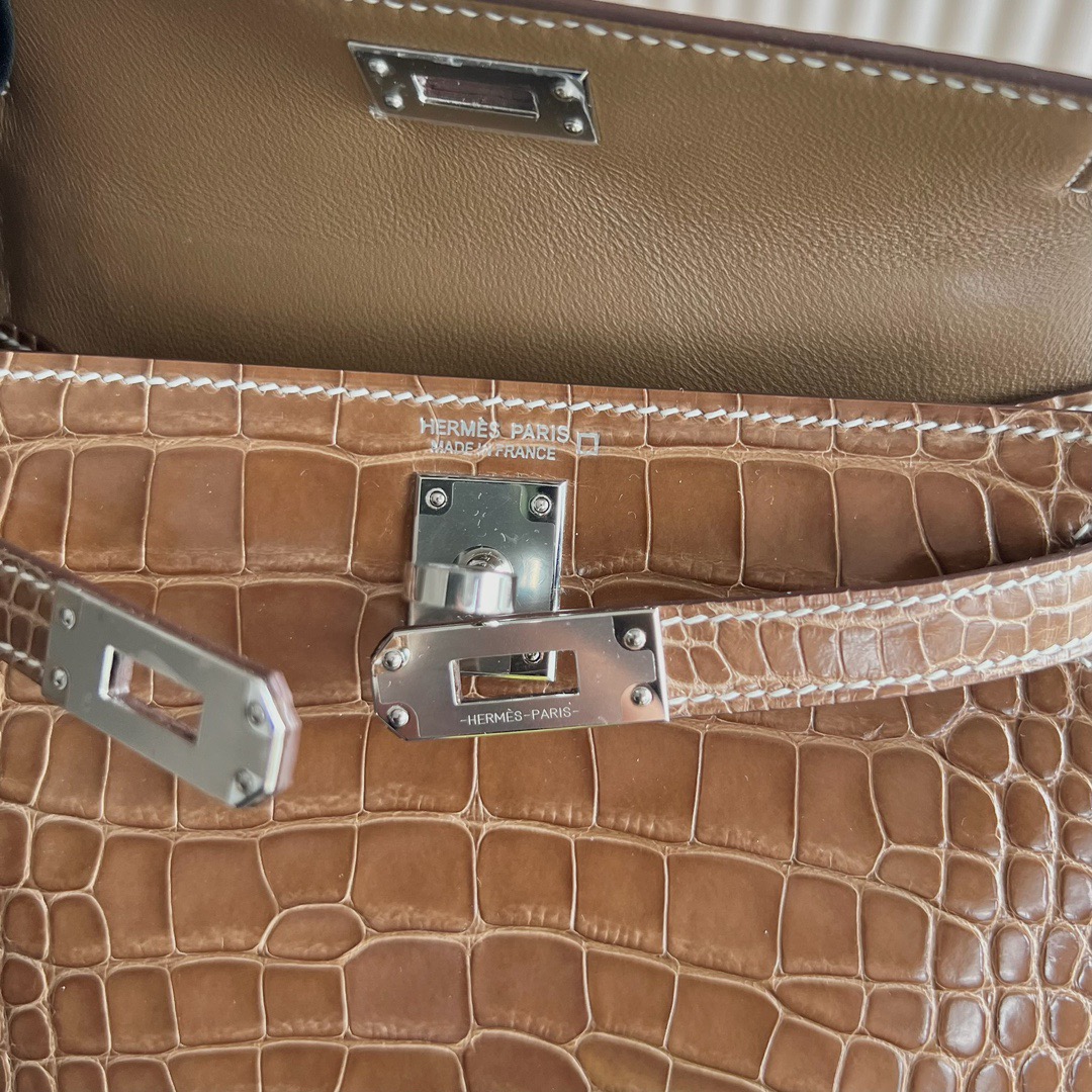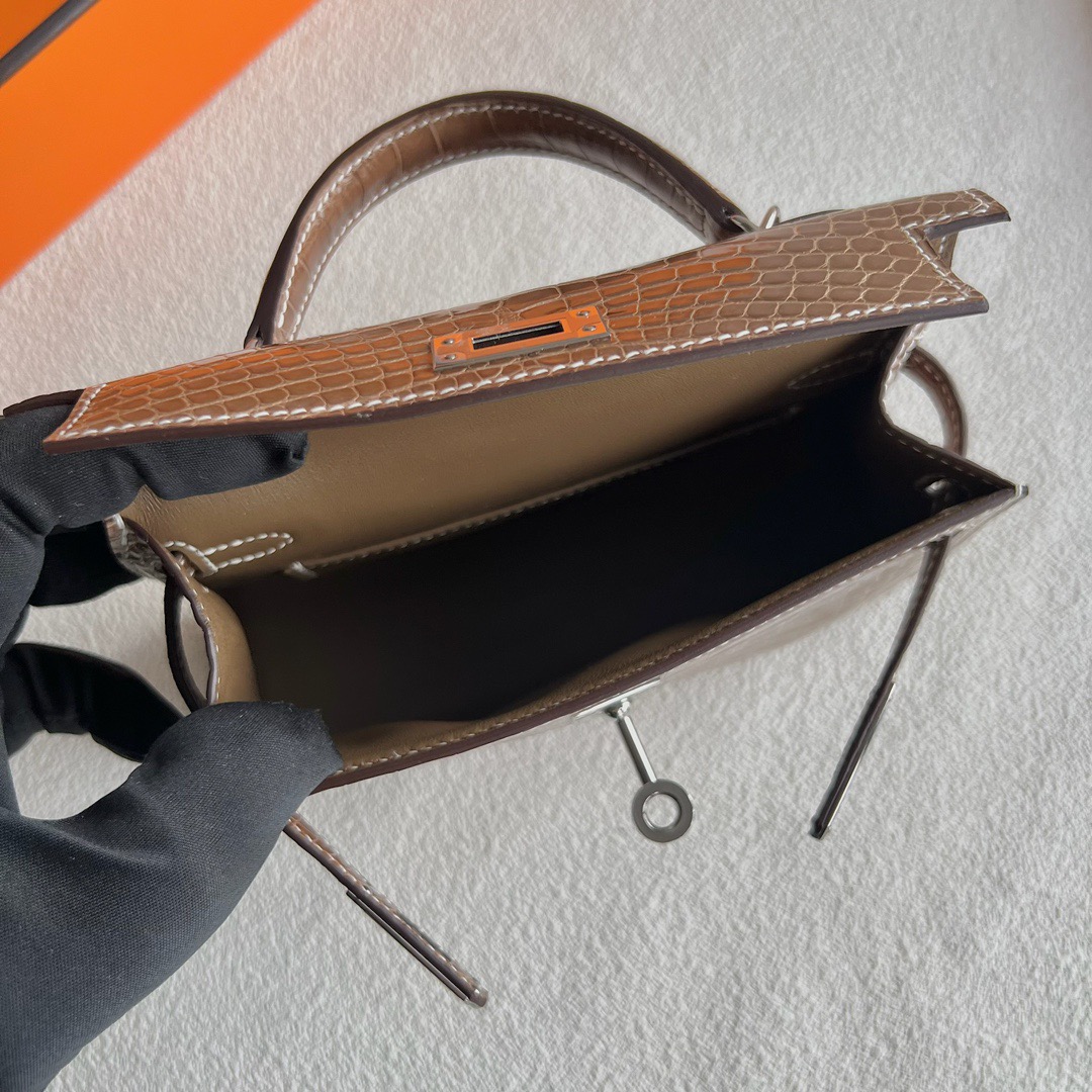 Taichung City, Taiwan Hermes Kelly Mini Bag Price 2025 polished Mississippiensis alligator CK17 Ficelle 淡灰褐色 烟草色 Palladium Hardware(PHW)