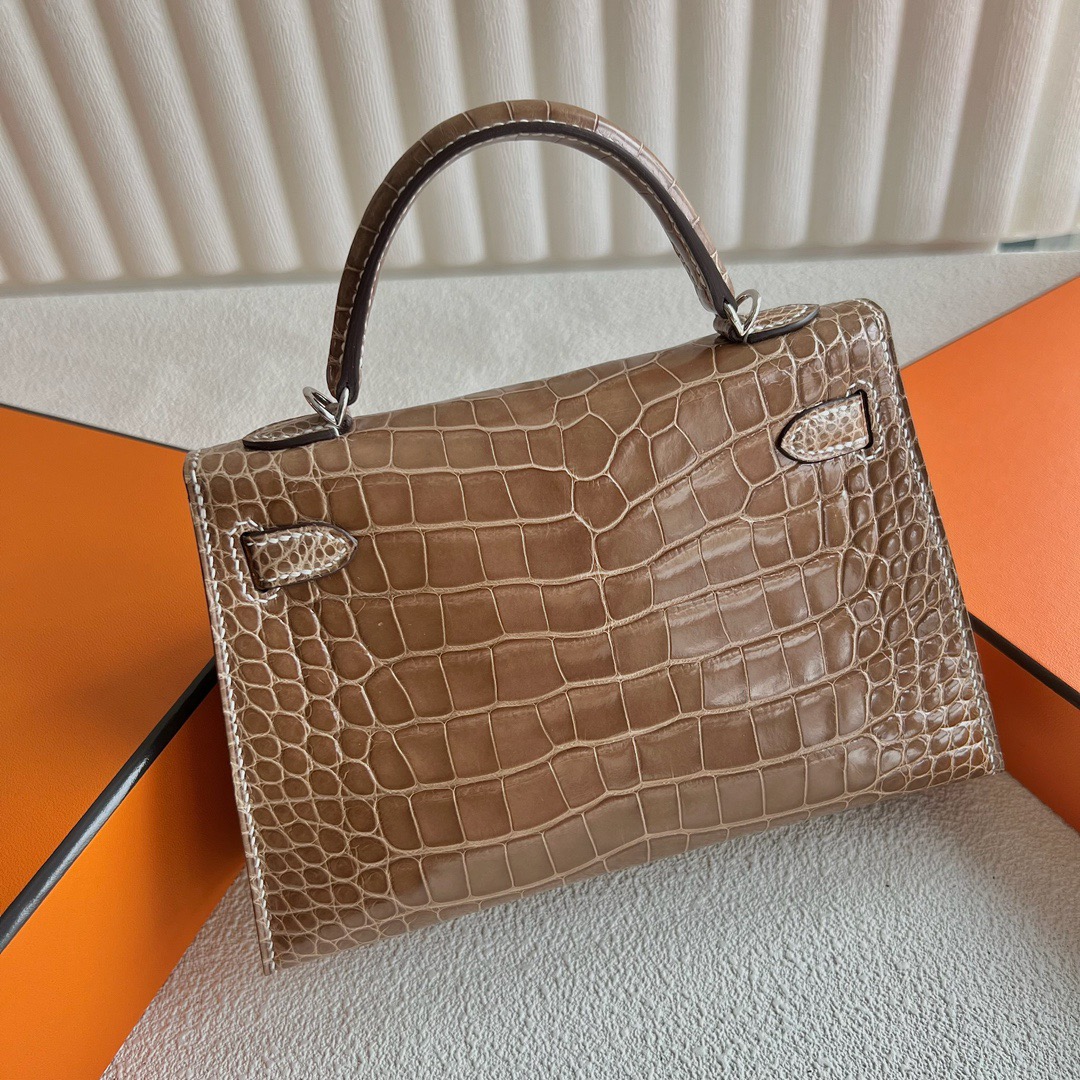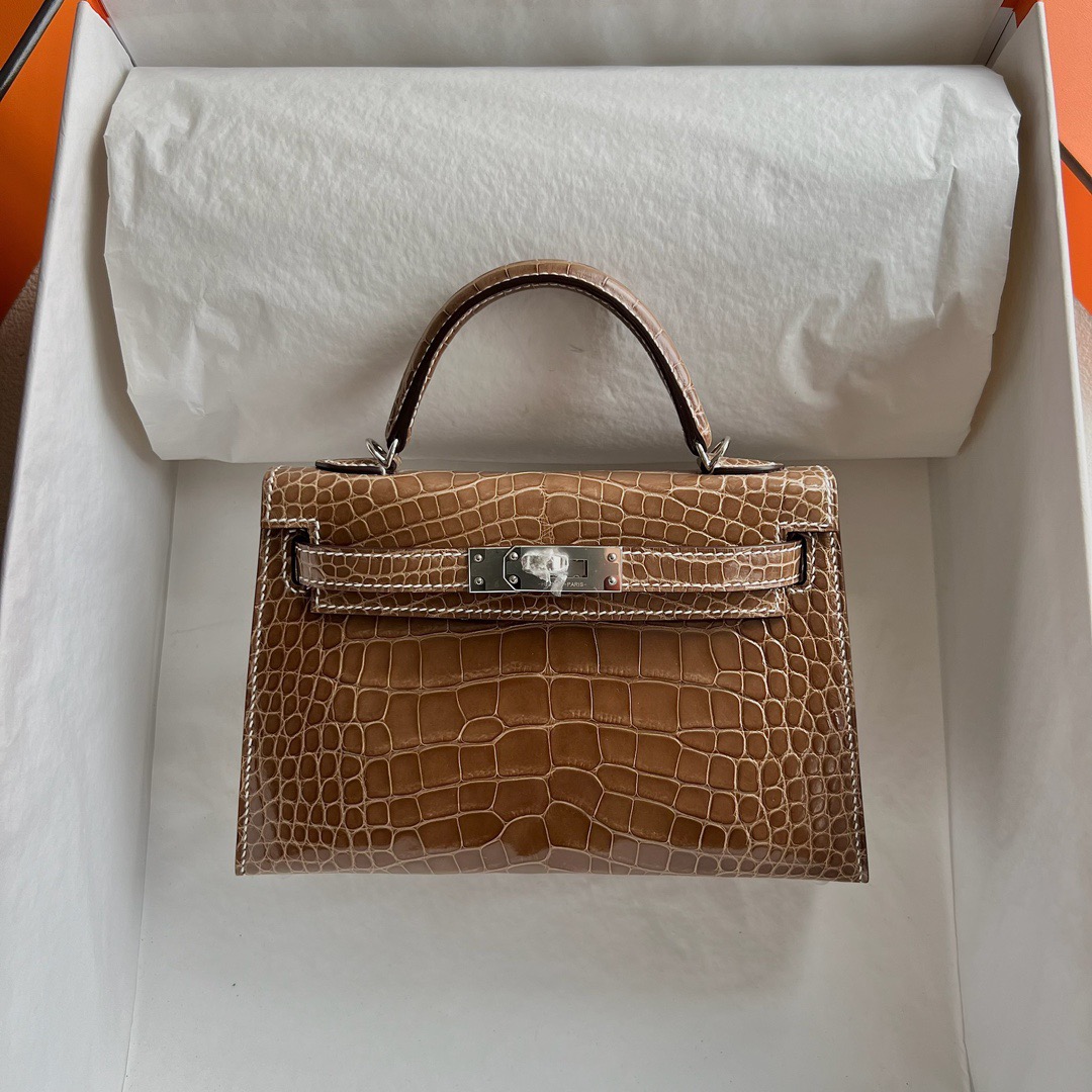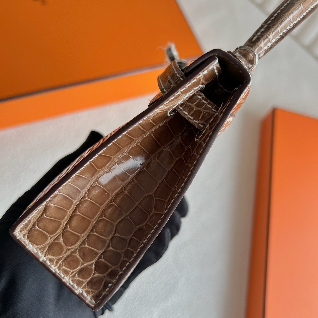 Taichung City, Taiwan Hermes Kelly Mini Bag Price 2025 polished Mississippiensis alligator CK17 Ficelle 淡灰褐色 烟草色 Palladium Hardware(PHW)