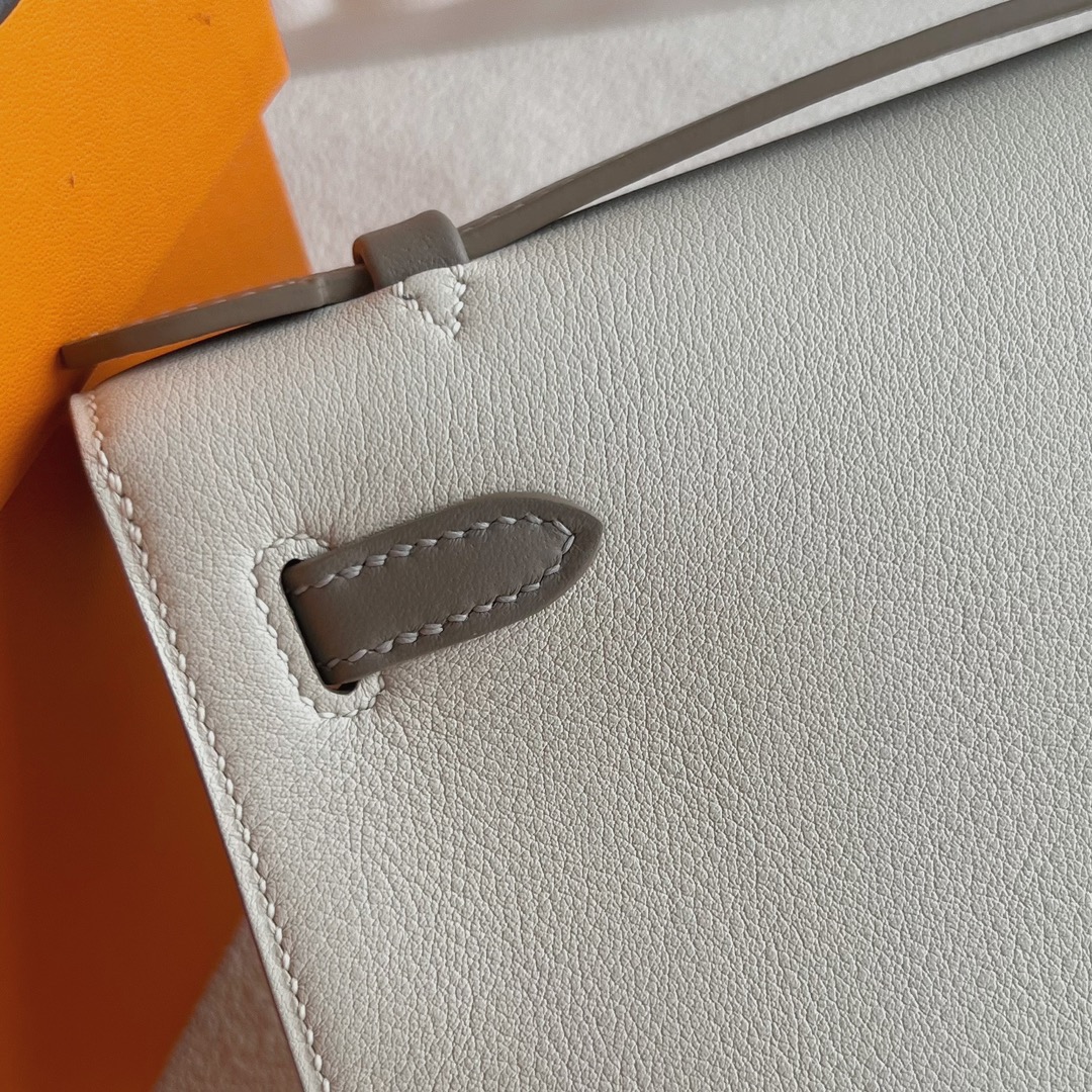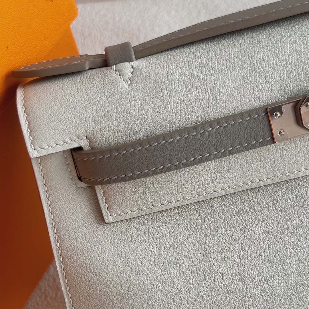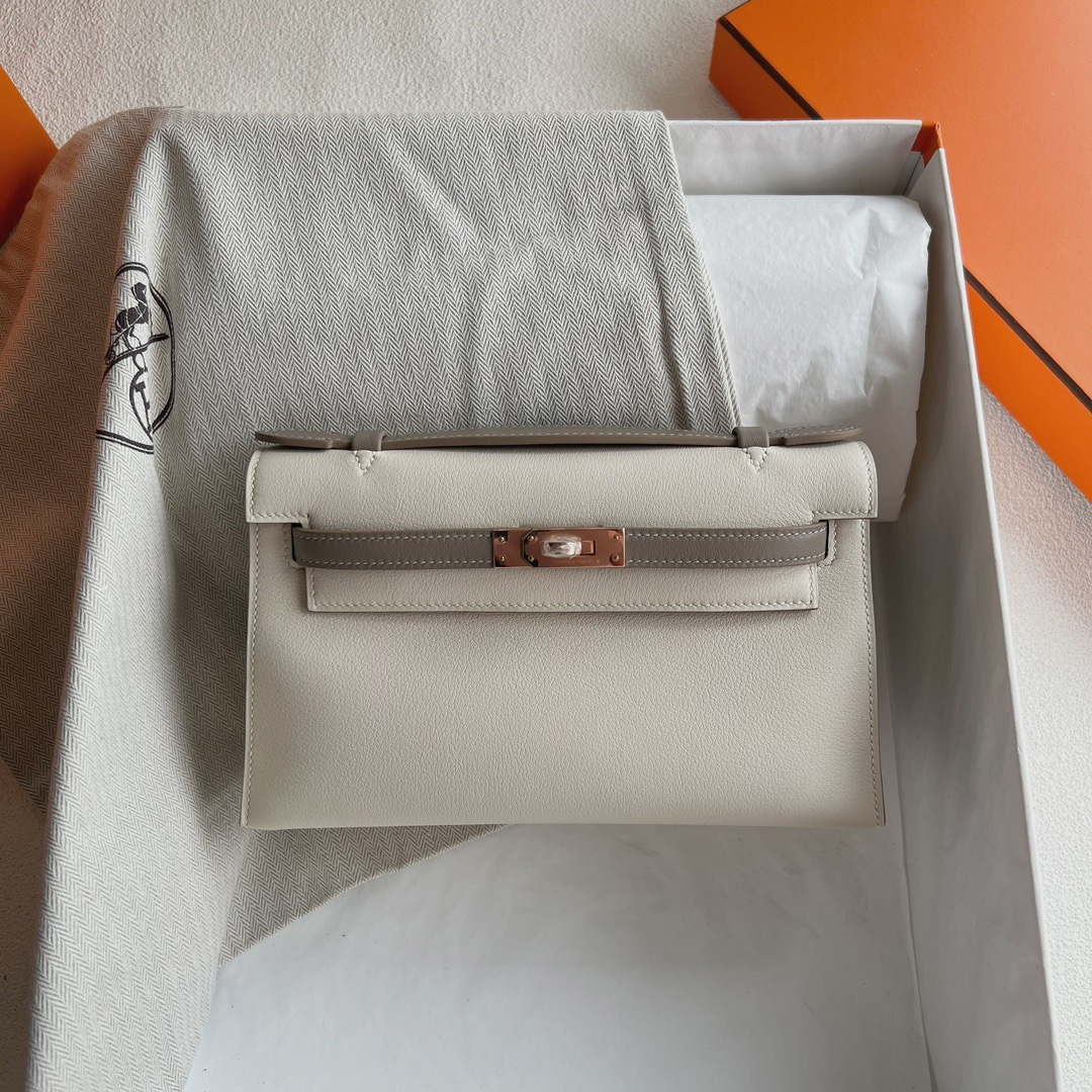 Hermes Mini Kelly Pochette 22cm Swift Leather CK10奶昔白 And M8 Gris Asphalte 沥青灰、马路灰 Rose Gold Hardware(RGHW)