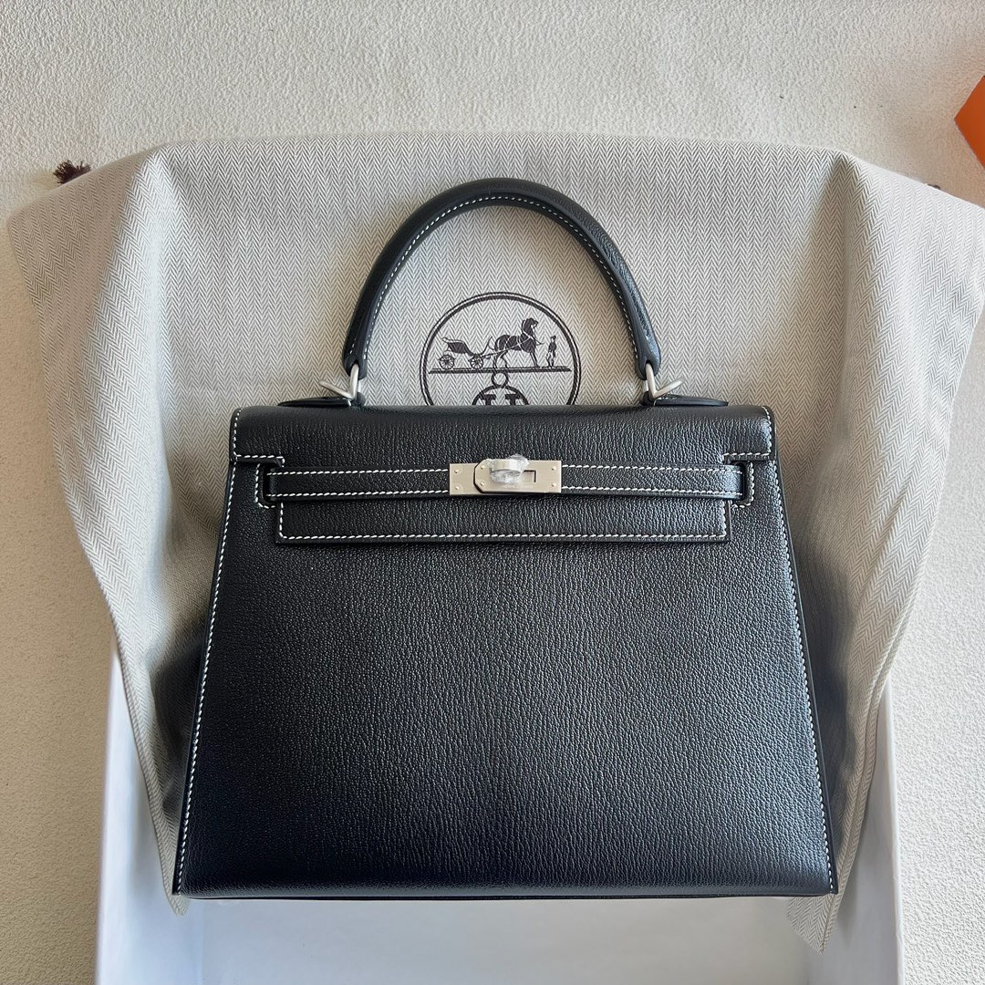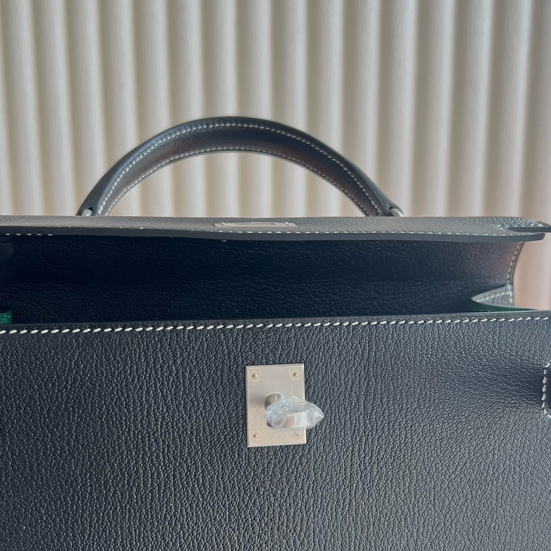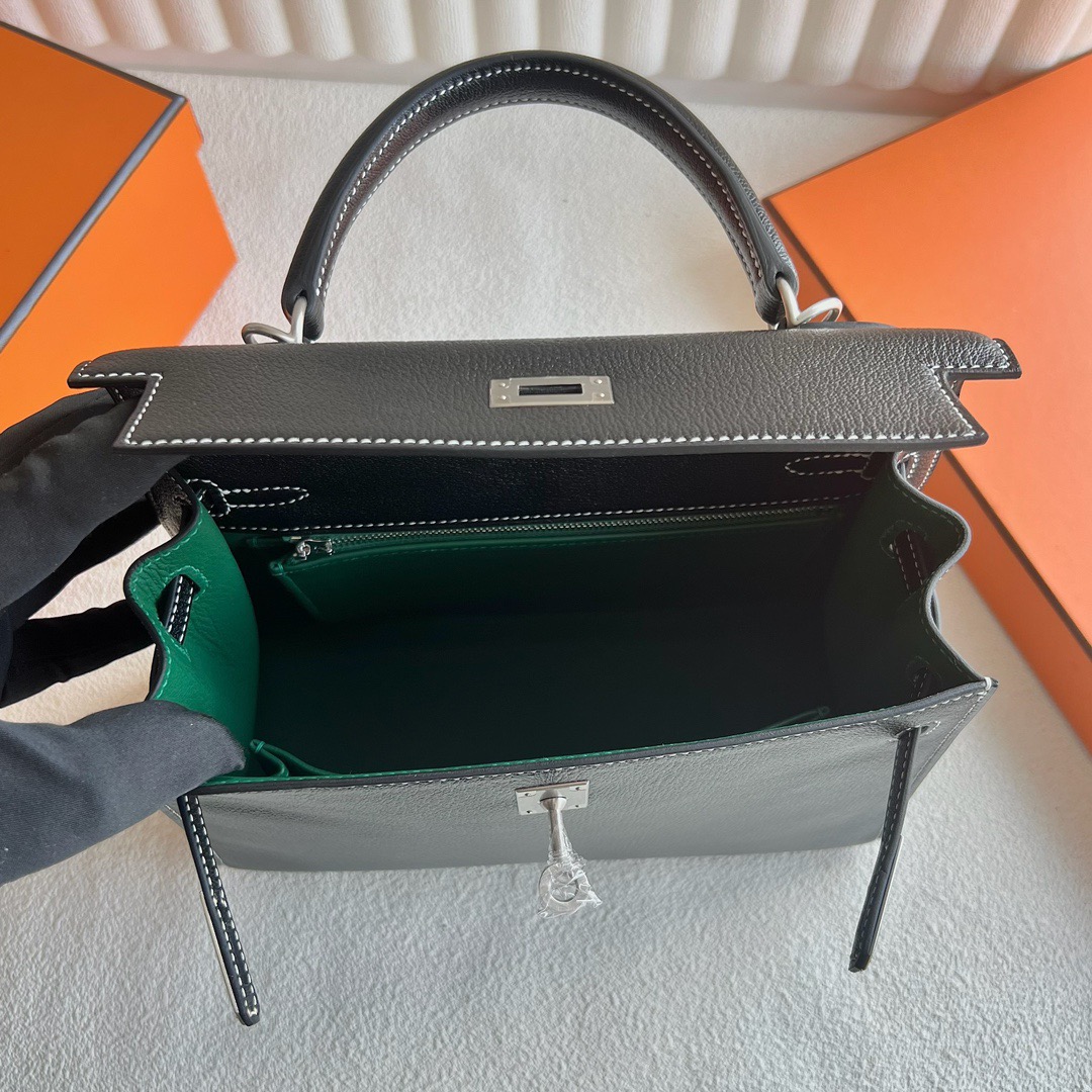 Hermès Special Order Kelly 25cm Chevre Mysore 89 Noir 黑色 And U4 Vert Vertigo 丝绒绿 Brushed Palladium Hardware(BPHW)