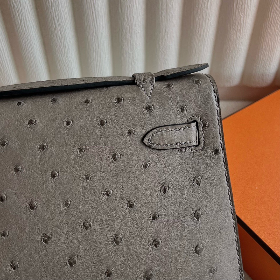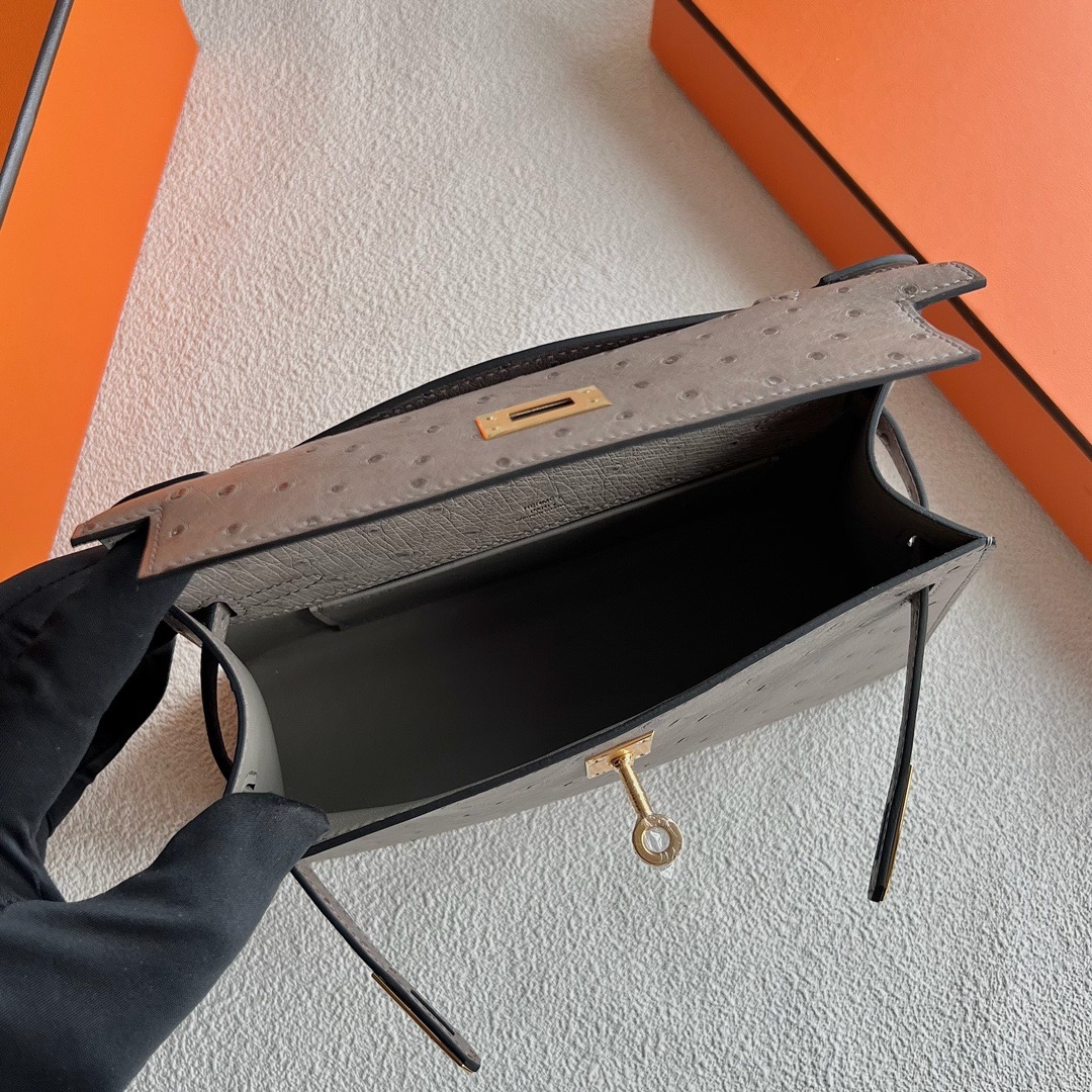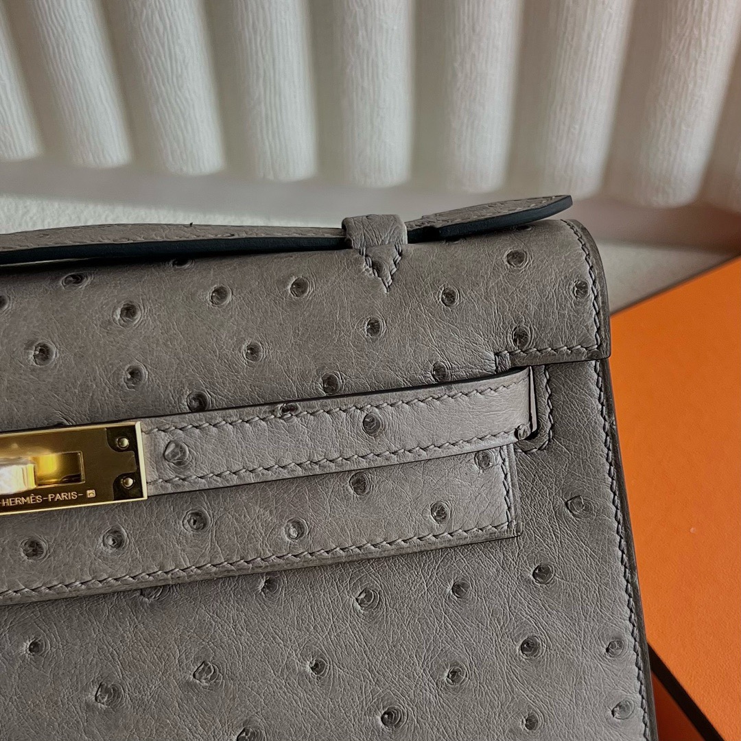 Hermès Mini Kelly Pochette 22cm South Africa Klein Karoo Original Leather Ostrich 81 Gris Tourterelle 斑鸠灰 Gold Hardware(GHW)