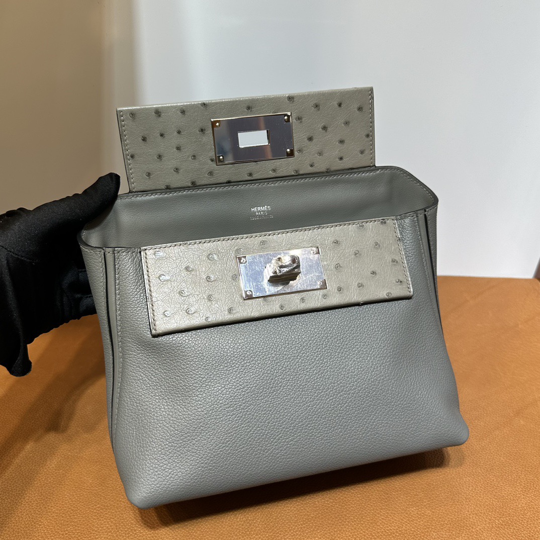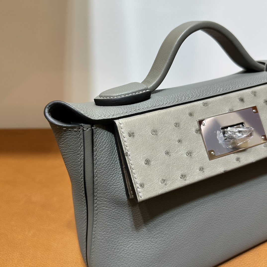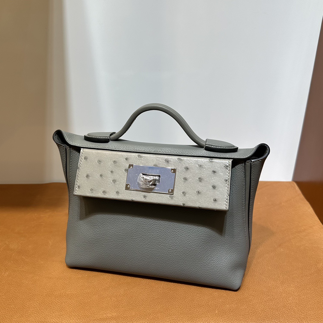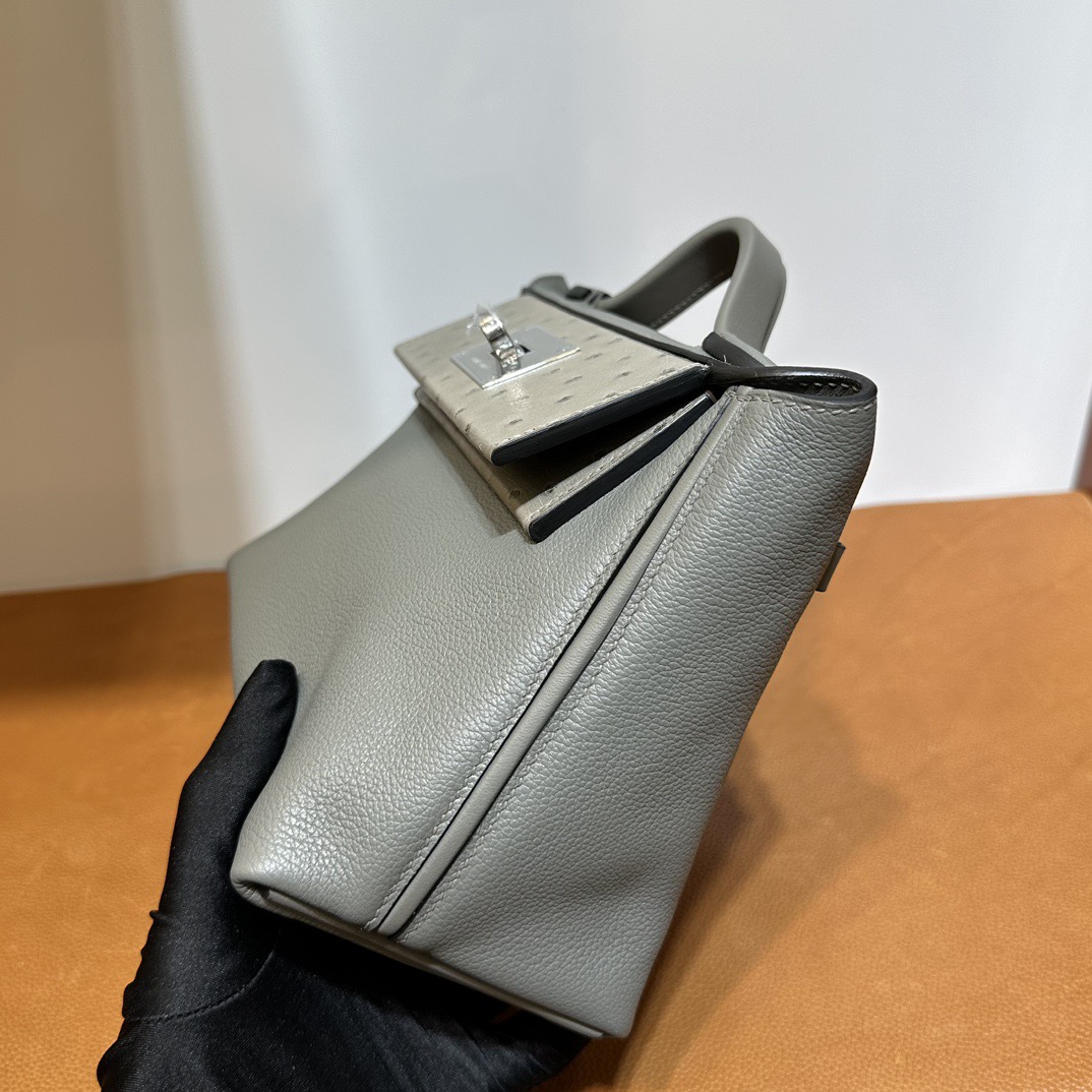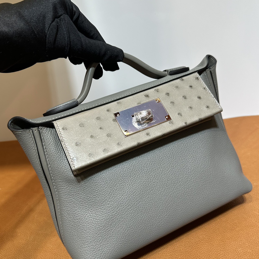 Hermès Mini 24 24 Touch 21cm Evercolor Leather And Ostrich 0L Gris Meyer 积雨云灰 Palladium Hardware(PHW)